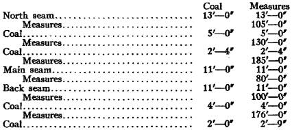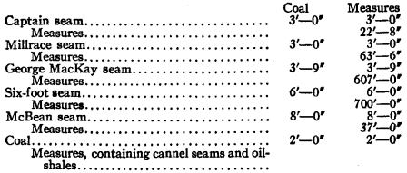 Mining operations, in depth, have corroborated the exact truth of this observation. As is the case in many coal-fields, the coal seam horizons seem fairly persistent, although the thickness of the individual seams, and the intervening strata, vary very considerably within comparatively small distances. A study of the palaeontological evidence to be found in the roofs and pavements of the coal seams, and microscopic examination of coal sections from the several seams, would doubtless throw much light on the problem of correlating the seams in the three divisions of the Pictou coal-field. The district north of the known limits of the Pictou field, in the direction of New Glasgow, is overlain by the New Glasgow Conglomerate and Permian rocks; but explorations have so far tended to confirm the opinion of the Geological Survey, namely, that the Permian in this district overlies unconformably either Millstone Grit or Devonian Measures. The Vale area contains a series of coal seams bent into a synclinal basin, along a northeasterly axis, measuring about three miles across from crop to crop of the lowest seam. This series of seams is believed to be a higher series than those contained in the Albion area, the thickness of strata intervening being estimated at about 1,600 feet, containing beds of oil-shale, but no coal seams, so far as is known. The territory between the East river and the outcrop of the lowest seam in the Vale synclinal basin, measures roughly, two miles. All the higher series of seams have been eroded in this territory, and, moreover, the barren area is faulted and disturbed in a manner not thoroughly understood, except that the dip of the strata changes from a direction towards the axis of the Vale syncline to a dip towards another syncline that runs east and west through the Allan shafts, and is roughly parallel with Fraser's mountain. A typical section of the Vale seams is as follows--but, as in the other areas of the Pictou field, the seams and the intervening strata show great variations.