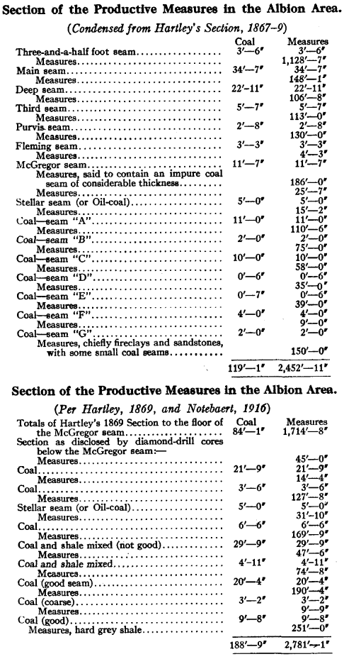 Coal was first discovered in the Pictou field in 1798, when prospecting was carried on along the banks of the East river, and small quantities were mined from the outcrop of the main seam, the coal being lightered down the East river for shipment to Halifax and other points along the coast. Coal mining operations on a large scale were commenced by the General Mining Association in 1827, in the vicinity of the present town of Stellarton, and were continued by this Company until 1874, when the property was sold to the Halifax Company, Limited. In 1854 coal was uncovered near Westville and mining operations were commenced by the Black Diamond Company. In 1868 the Acadia Colliery and the Drummond Colliery commenced. In 1872, the Vale Coal & Iron Manufacturing Company began operations on what is now known as the Vale area, near the present village of Thorburn. In 1886 the Acadia, Vale, and Halifax Companies were amalgamated to form the Acadia Coal Company, which thus came into possession of areas and collieries in all three divisions of the Pictou field. In the following year the Acadia Coal Company acquired the Black Diamond properties. Since this time there have been but two operating coal companies in the Pictou field, namely, the Acadia Coal Company, and the International Coal Mining Company operating the Drummond Colliery at Westville. (1) The Acadia Coal Company at the present time is working its areas in the Albion district only. The Albion mine has two main slopes, drawing coal from workings in six seams, and reference to the section of the Albion measures (see page 26), will show the number of untouched seams that can, if desired, be made tributary to these slopes. The Allan shaft mine draws coal from workings on the Cage Pit and the Ford seams. The Allan shafts were sunk in what appears to be the deepest part of the coal basin. There are two shafts, the deepest in eastern Canada, one 962 feet and the other 1,440 feet deep. The Cage Pit seam is, on an average, 15 feet thick at this point, and the Ford seam measures up to 40 feet in thickness, and in some places very considerably more. The Ford seam in this locality is most variable, both in thickness and inclination, the ground being very troubled. Because of the faulted character of the seam, it has proved costly to work, and has necessitated costly stone drifting. Recently, the management have carried out extensive prospecting by diamond drill borings of small diameter, and valuable information has been obtained in this way, at comparatively small expense. The Vale colliery, in the eastern division, and the Acadia colliery, in the western division--both owned by the Acadia Coal Company--are closed down, because of the exhaustion of the profitably workable coal, and the unremunerative nature of the mining operations. The future of these mines, and the working of the other seams contained in the areas in which they are situated, is dependent on the selling price of coal and the local demand. Belgian capital was several years ago invested in the Acadia Coal Company, and large capital expenditure has been incurred in proving and developing the property.