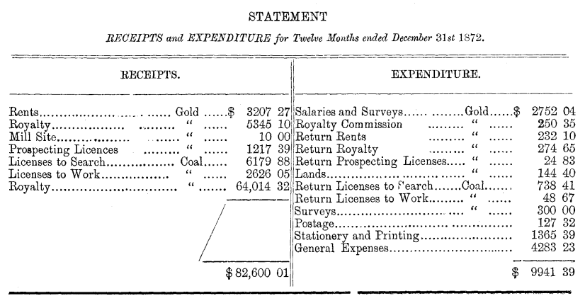 | Dept. Mines 1872 | Mining Statistics | Receipts | Receipts Other | ||