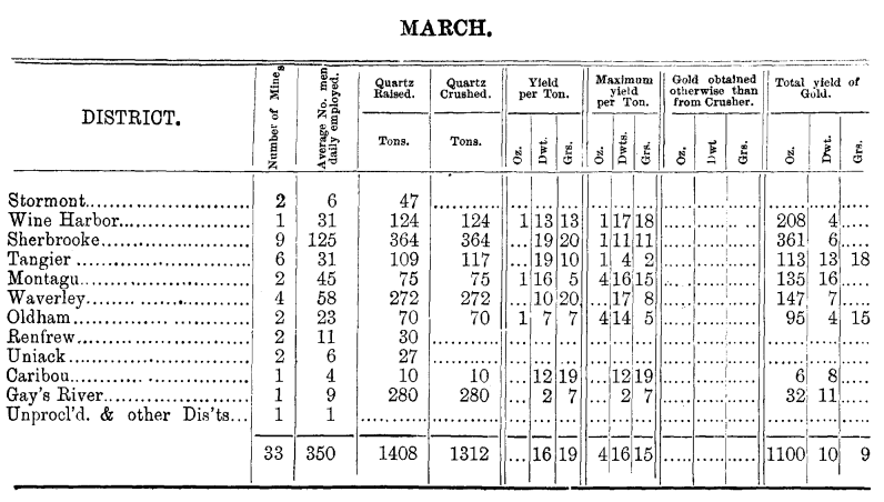 | Dept. Mines 1873 | Mining Statistics | Gold Mar. | Gold Feb. | Gold Apr. | |