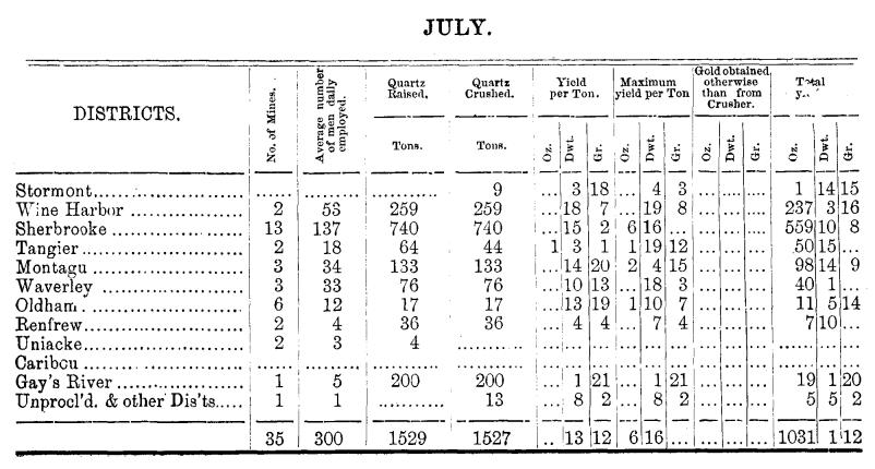 | Dept. Mines 1873 | Mining Statistics | Gold Jul. | Gold Jun. | Gold Aug. | |