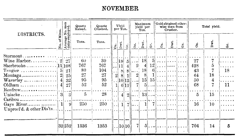 | Dept. Mines 1873 | Mining Statistics | Gold Nov. | Gold Oct. | Gold Dec. | |